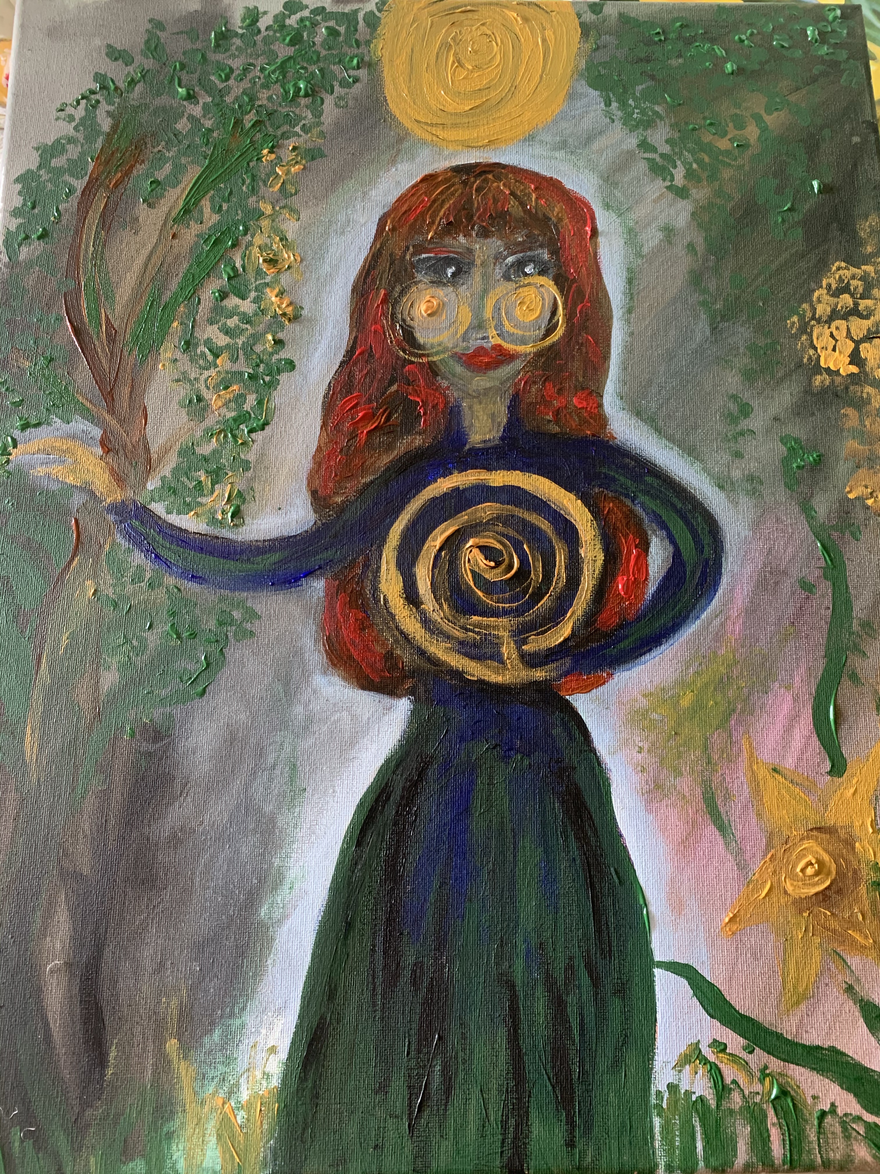 So I took out my acrylics and began to paint. I’m not an artist. I enjoy art. As I painted it was like I was shedding loads of layers of grey and creating beautiful colours. My painting is of the Goddess Brigid. She is a daughter the Dagda, one of the more universal deities of the pagan Celtic world. She is known as the Goddess of Healers, Poets, Smiths, Childbirth and Inspiration; Goddess of Fire and Hearth and a patron of warfare. She is my Guide. ❤️.